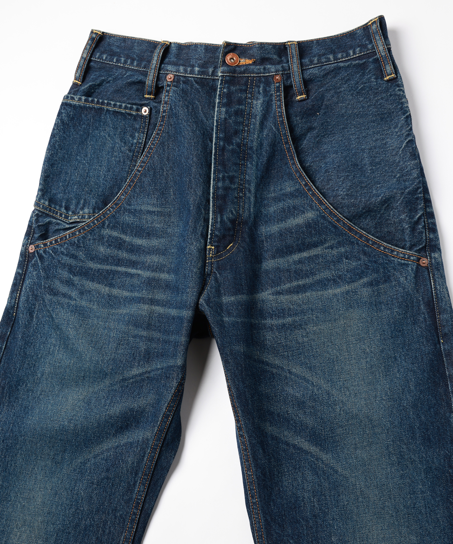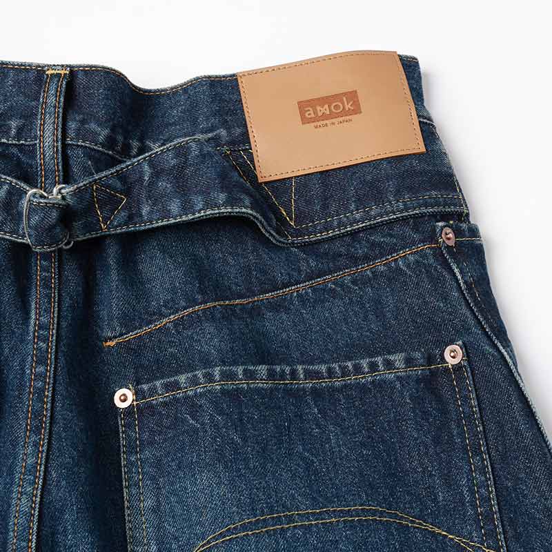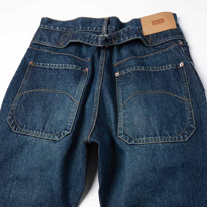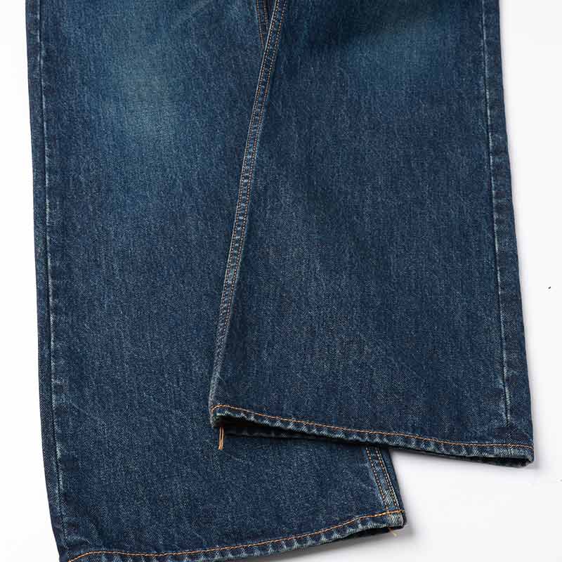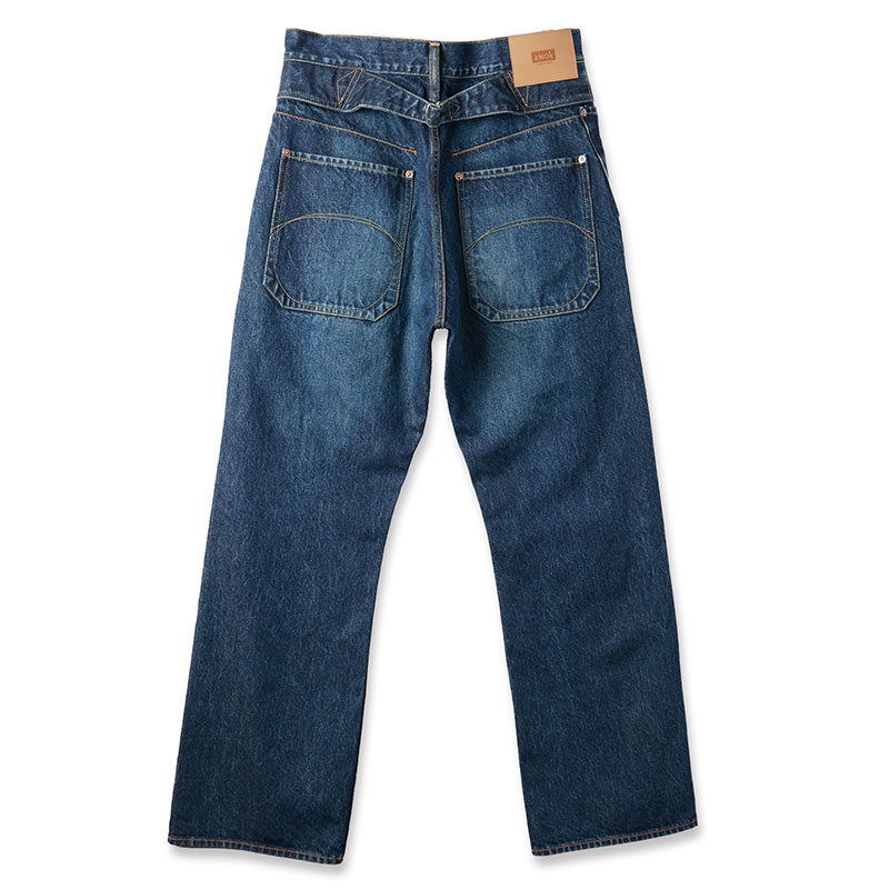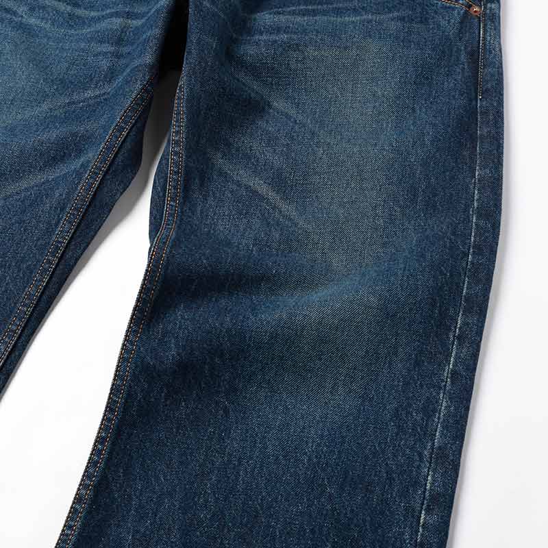 生地は13oz NATURAL SLUB DENIM。デザインはRe-Engineering Jeansからのアイデアで独特なデザインの5PK型でポケット口が広く使いやすいデザインに加えブリーチ、オーバーダイ、ブラストシェービング+ヒゲ加工を施しました。
