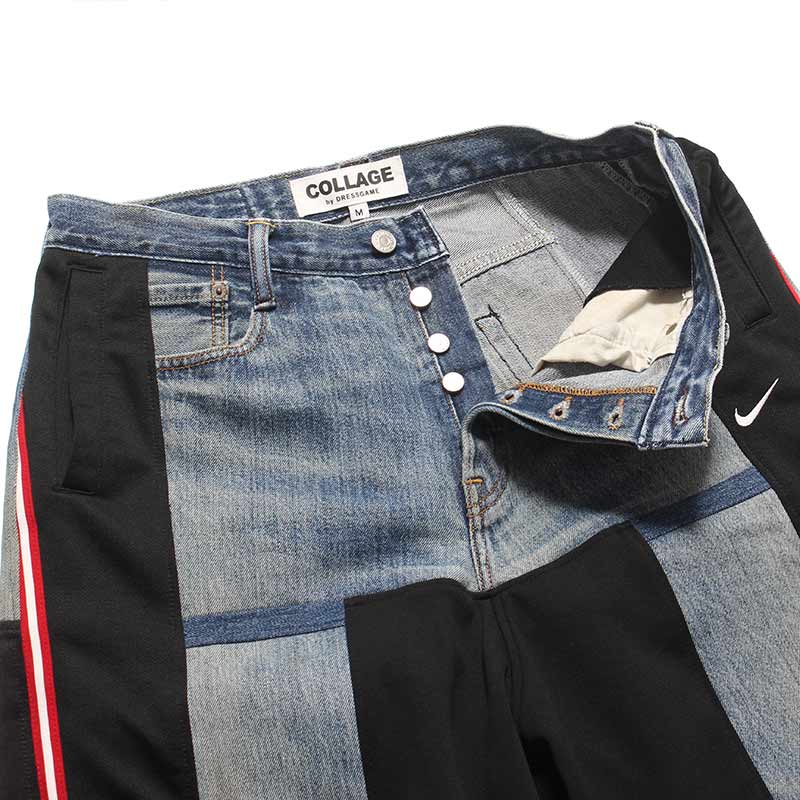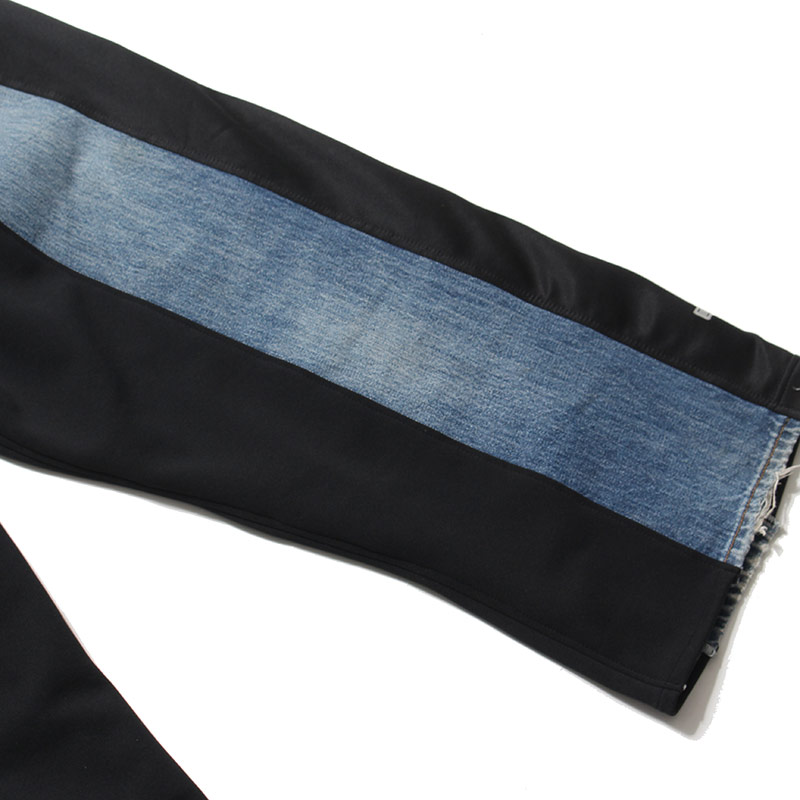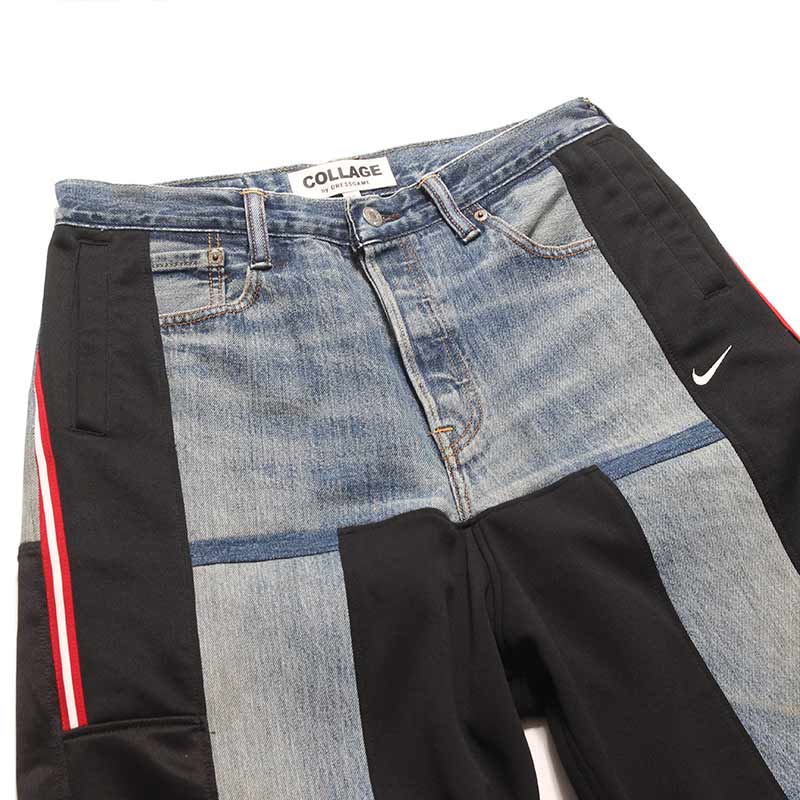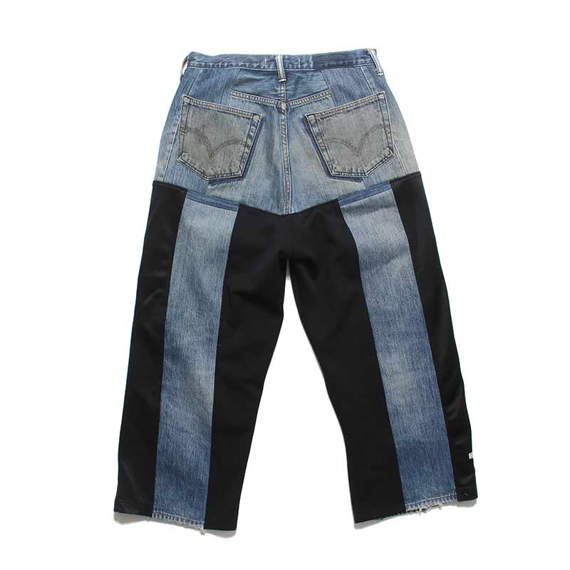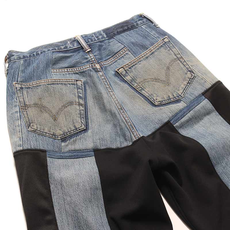 Vintage Levi’s 501を全て解体し、NikeなどのスポーツブランドのVintage Jerseyを使い再構築。 合計で3本のボトムスを使用している、3BOTTOMS REMAKE DENIM。