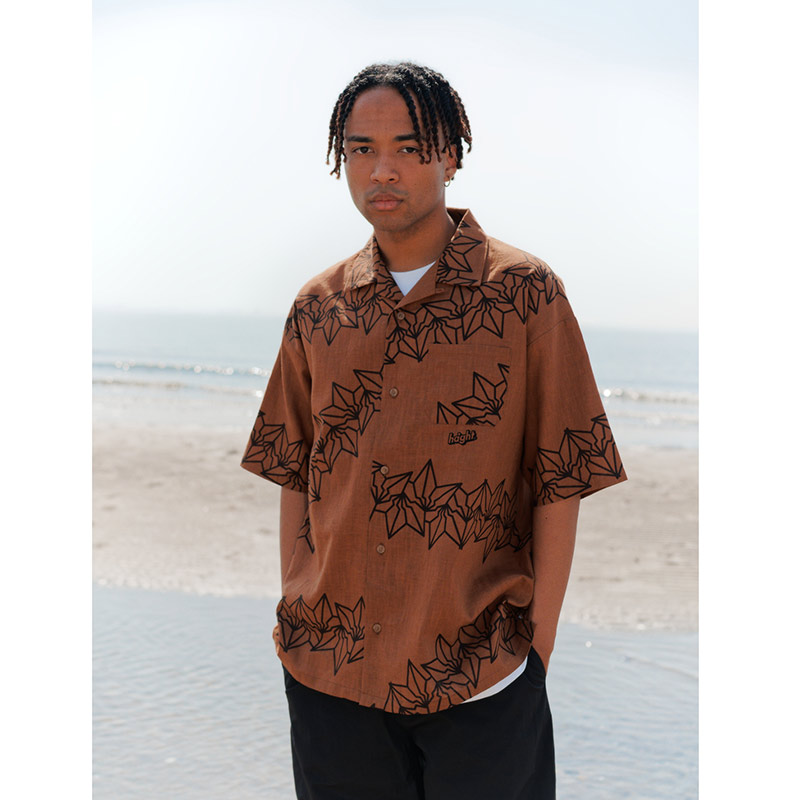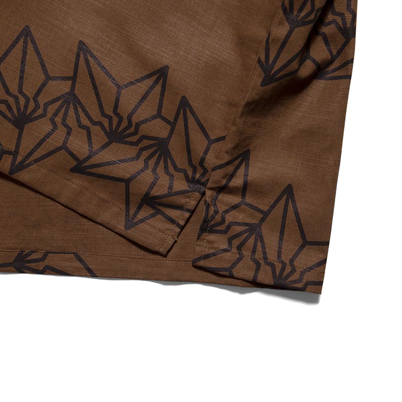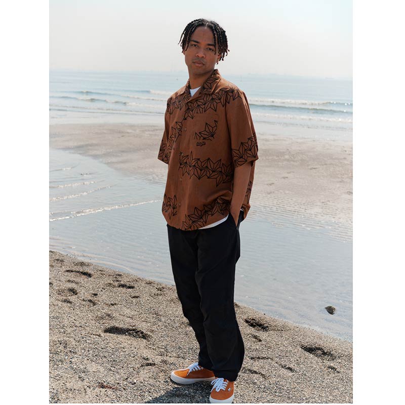 氏のシグネイチャーであるBAKI柄ランダムに落とし込んだオープンカラーシャツ。