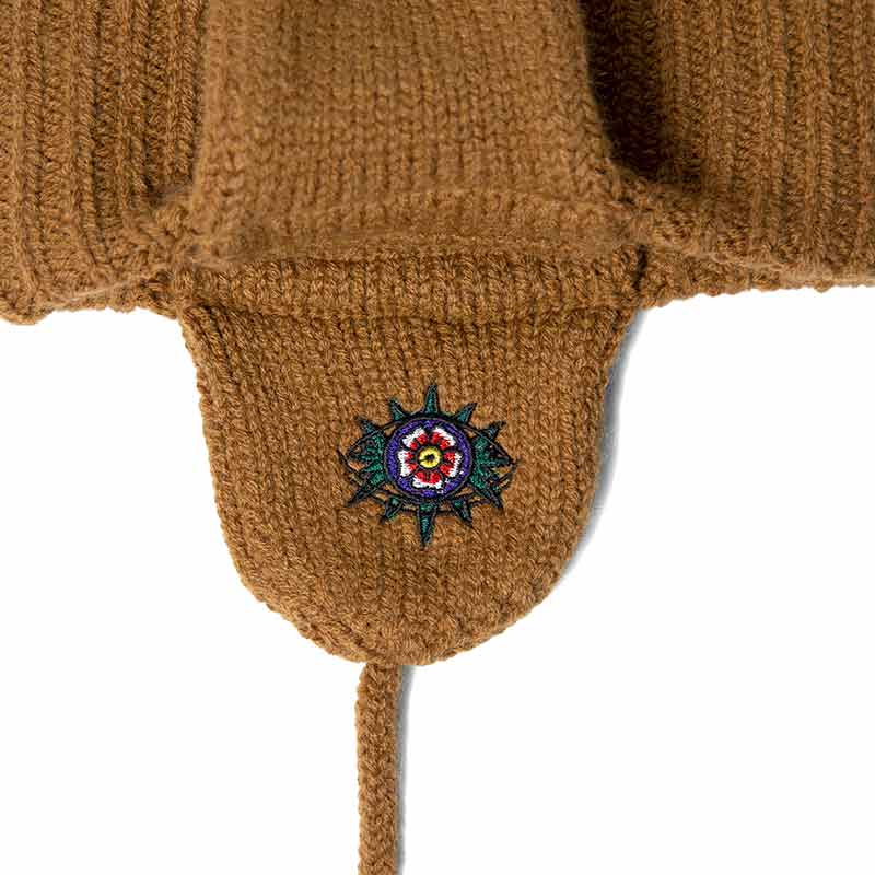 GRINDLODGEとのコラボレーションで仕上げたドッグイヤー付きのニットキャップ。