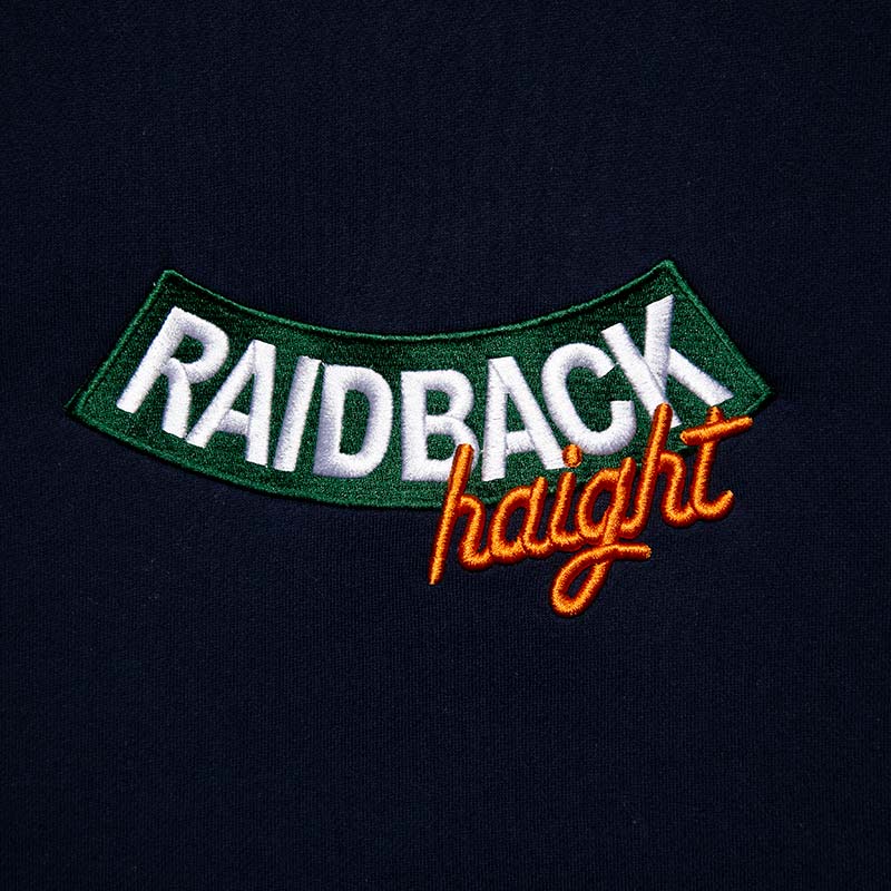 raidback® fabricを象徴する逆アーチのロゴに、haightのロゴを組み合わせたコラボレーショングラフィック を、緻密な刺繍で再現。