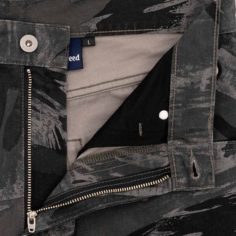 型はベーシックな 5 ポケットタイプで、 フロントは ZIP フライ、 ワタリの程良いボリュームと丈感に拘ったオリジナルシルエットです。