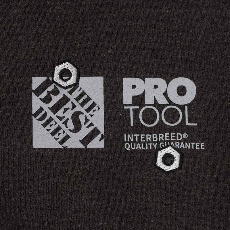 ホームセンターのユニフォームがコンセプトのデザインで、身頃には”Work”をテーマにサンプリングしたロゴをシルクプリントを配置し、左胸プリント上にはナットの刺繍を重ねています。