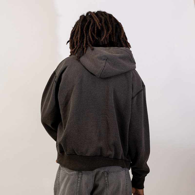 肉厚な12.4ozオンス裏起毛スウェットを使用し、製品加工により、着古したスウェットの生地感を表現しています。